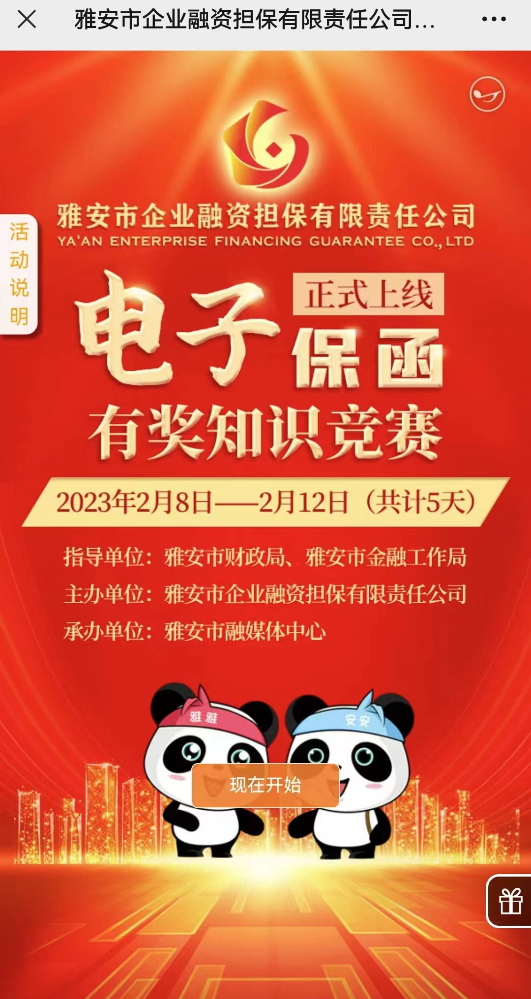 該活動(dòng)由市財(cái)政局和市金融工作局指導(dǎo),雅安市企業(yè)融資擔(dān)保有限責(zé)任公司(以下簡(jiǎn)稱(chēng)“市擔(dān)保公司”)主辦,雅安市融媒體中心承辦。市擔(dān)保公司作為我市唯一一家政府性融資擔(dān)保機(jī)構(gòu),也是雅安公共資源交易中心上線(xiàn)的唯一一家本地全類(lèi)別保函服務(wù)商。2月6日,市擔(dān)保公司“電子投標(biāo)保函”業(yè)務(wù)在雅安公共資源交易中心正式上線(xiàn)。為讓更多的受眾了解“電子投標(biāo)保函”業(yè)務(wù),市擔(dān)保公司主辦了此次線(xiàn)上有獎(jiǎng)知識(shí)競(jìng)賽活動(dòng)。